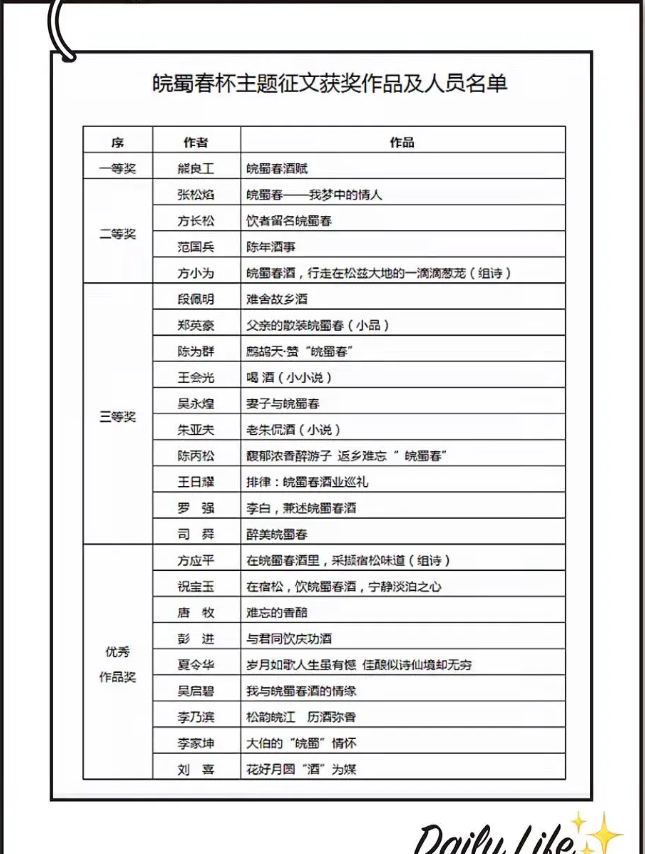 附:皖蜀春杯主題征文獲獎作品及人員名單(外地(dì)沒有趕來參會的(de)獲獎作者的(de)獎品和(hé)榮譽證書已寄出,請注意查收。)